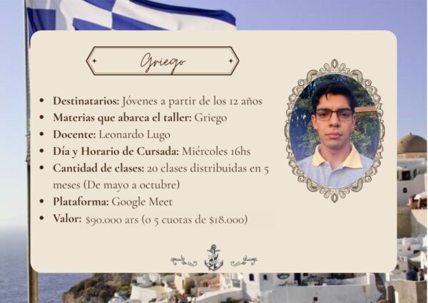 El taller de Griego propone una introducción a la lengua griega clásica, orientada a comprender sus estructuras fundamentales y a reconocer las raíces culturales y lingüísticas del pensamiento occidental.